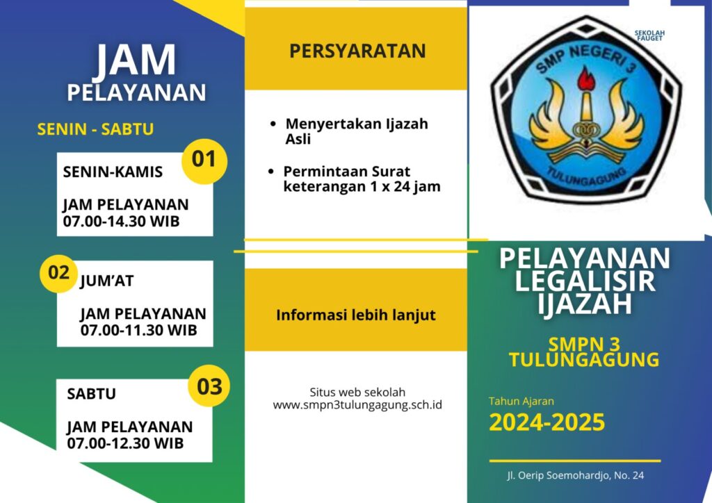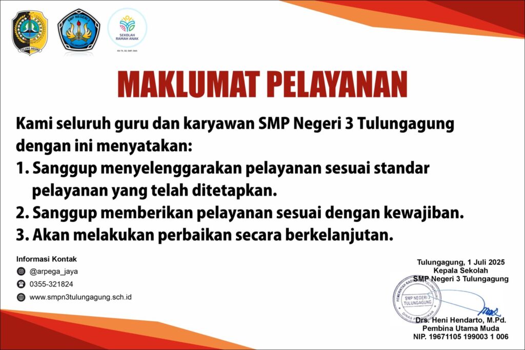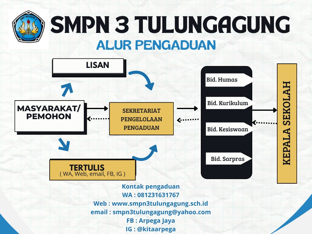 Dalam upaya meningkatkan mutu dan kualitas pelayana layanan publik SMPN 3 Tulungagung siap melayani lapotan pengaduan dan saran melalui : WA : 081231631767 Web : www.smpn3tulungagung.sch.id email : smpn3tulungagung@yahoo.com FB : Arpega Jaya IG : @kitaarpega